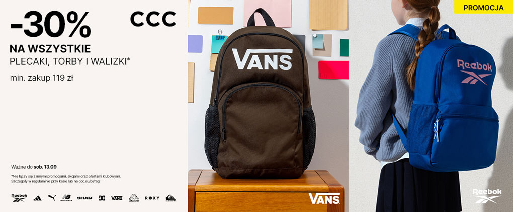 Tam, gdzie jedni ruszają na ostatnie letnie wyjazdy, inni przygotowują się na powrót do szkoły lub biura i… świetnie się składa! Teraz w CCC wszystkie plecaki, torby i walizki 30% taniej! Aby skorzystać z okazji wystarczy zrobić zakupy za min. 119 zł. Reebok, adidas, VANS, Badura, Gino Rossi i inne znane marki w supercenach czekają!