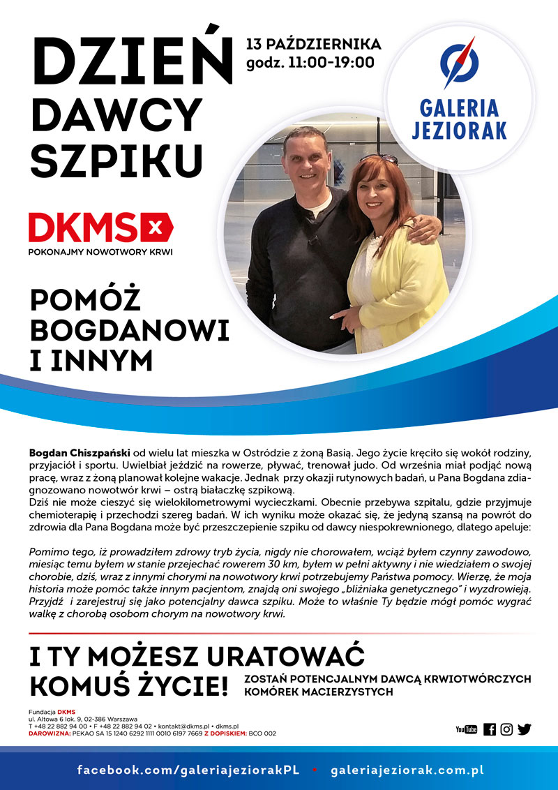 Bogdan Chiszpański choruje na ostrą białaczkę szpikową. Być może jego jedyną szansą na powrót do zdrowia jest przeszczepienie szpiku od dawcy niespokrewnionego. Każdy z nas będzie miał okazję dołączyć do bazy potencjalnych dawców szpiku już 13 października w Galerii Jeziorak.